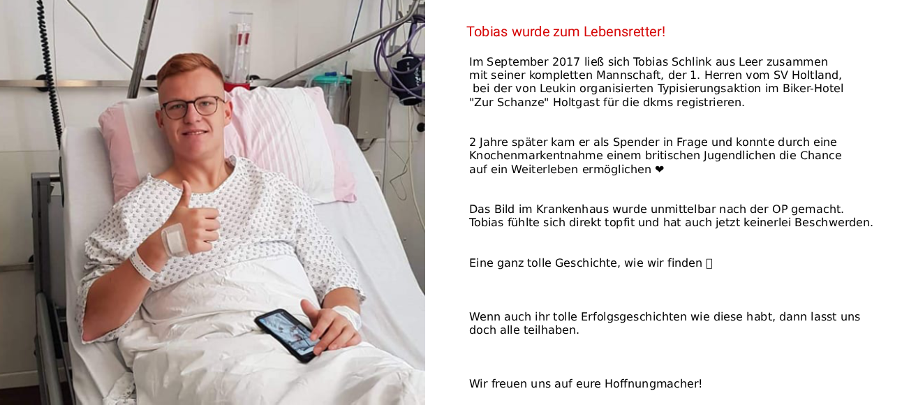 Im September 2017 ließ sich Tobias Schlink aus Leer zusammen mit seiner kompletten Mannschaft, der 1. Herren vom SV Holtland, bei der von Leukin organisierten Typisierungsaktion im Biker-Hotel "Zur Schanze" Holtgast für die DKMS registrieren.